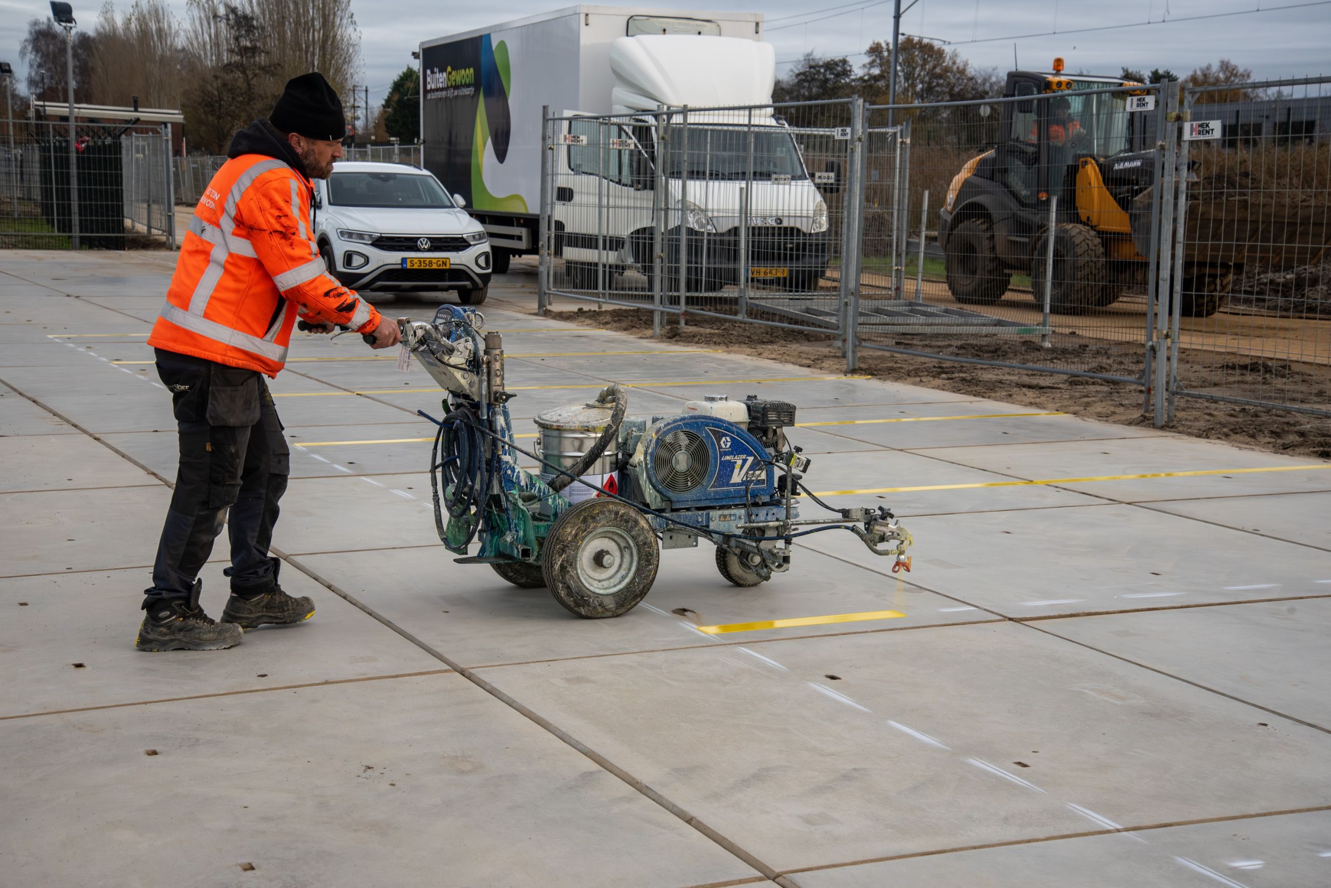 Maar een verharde ondergrond alleen is niet genoeg. Zonder heldere belijning blijft het giswerk: waar parkeren we, hoe rijden we in en uit, en hoe houden we de doorstroming soepel?